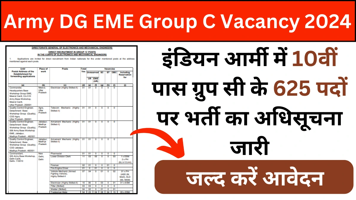 Army DG EME Group C Vacancy 2024: इंडियन आर्मी में 10वीं पास ग्रुप सी के 625 पदों पर…